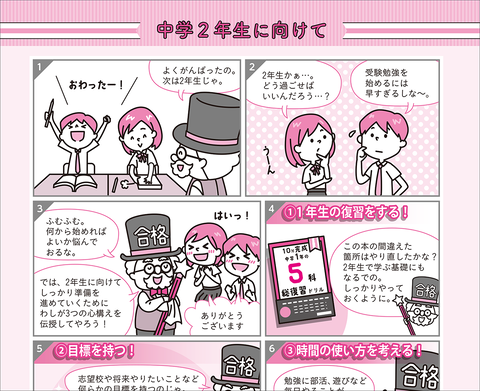 さらに、巻末ではオリジナルキャラクターが中学2年生への準備ポイントをやさしく解説。復習をすることや目標を持つこと、時間の使い方に関する考え方などを紹介している。