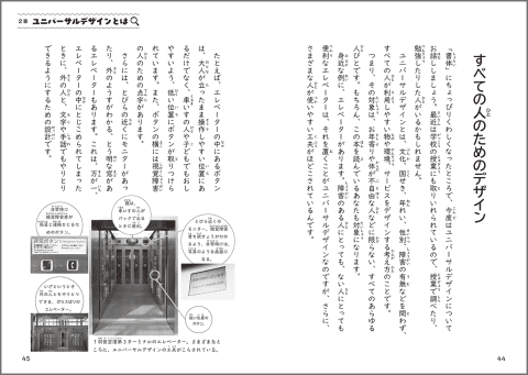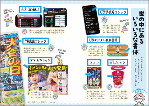 さらに、UDデジタル教科書体が生まれるまでのプロセスのほか、「書体とは何か」「ユニバーサルデザインとは何か」といった基礎的な内容を児童向けにわかりやすく解説。身の回りの本や看板、デジタル機器の画面などに使われている文字を紹介するカラーページから始まり、書体の種類や特徴を豊富な図版や写真とともに学べる構成だ。