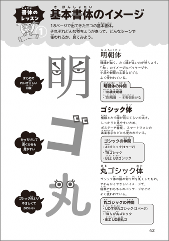 章と章の間には、明朝体・ゴシック体・丸ゴシック体という3大書体をキャラクター化して紹介するコラムや、高田氏がこれまで手がけてきた書体の紹介ページも掲載。本文の書体にもUDデジタル教科書体を採用しているため、物語を読み進めながら、この書体の読みやすさを実際に体感できる。
