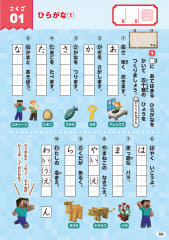 ドリルには、マインクラフトに登場するキャラクターやアイテムのイラストが多数登場。算数では、ニンジンやタマゴ、ブロックなどゲーム内のモチーフを数えたり比べたりしながら、「数の大きさ」「数の並び方」といった基礎を確認できる。