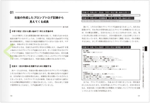 同書では、序章から第6章を通して、生徒の学びと教員の指導がどのようにアップデートされたかを解き明かしている。主な特徴は、中学校における16の授業実践事例とともに、指導案の略案やそのままコピーして利用可能なプロンプト集を掲載している点だ。