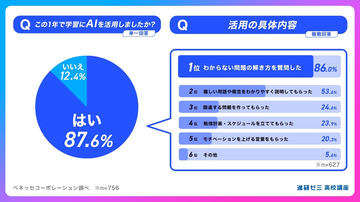利用用途数は、2021年10月の調査では平均1.7だったものが今回は3.7まで増加。「学習支援ソフトやアプリの利用」、「調べ学習」、「考えをまとめて発表」が前回調査と同様に上位となったほか、「教員と児童生徒のやりとり」「児童生徒同士のやりとり」といったコラボレーションの機能がそれぞれ大きく増え、教員とのやりとりは今回44%と前回から31ポイント増加した。