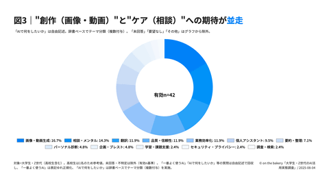利用目的については、画像や動画の生成を希望する声が最多(16.7%)で、次いで「相談・メンタルケア」が14.3%だった。そのほか「翻訳・品質」「情報の根拠確認・業務効率化」も11.9%の回答を集めており、用途の多様性が見られる。