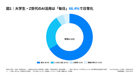 株式会社on the bakeryは、株式会社Shiningが運営する学生団体サミットに参加した大学生を中心としたZ世代116人を対象に、AIの活用実態に関する調査を実施し、2025年8月18日に調査結果を発表した。