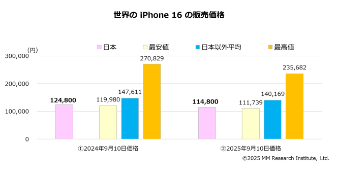 また、今回の新製品ではないが2024年発売のiPhone 16(128GB)はiPhone 17シリーズの発表とともに世界各国で値下げされ、日本は1万円値下げの114,800円で3位。日本以外の平均は140,169円。