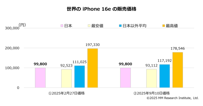 2025年2月発売のiPhone 16eについてはiPhone 17シリーズ発表でも価格は変わらず99,800円。最安は中国の93,112円で、日本は、ベトナム、米国、香港、オーストラリアに次ぐ6位。日本以外の平均は117,192円。