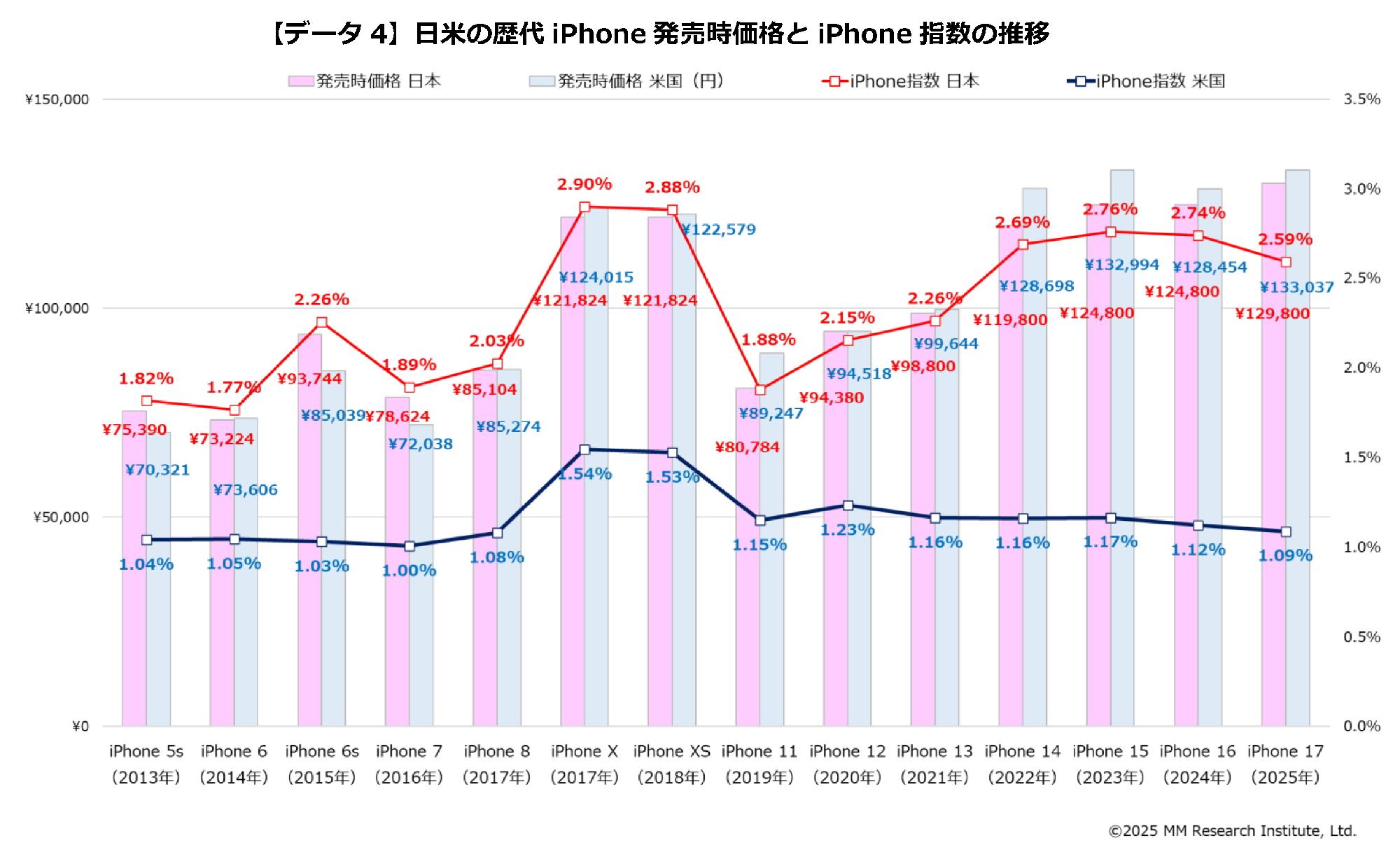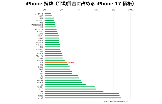 日本のiPhone指数(iPhone 17の価格÷平均所得)は2.59%