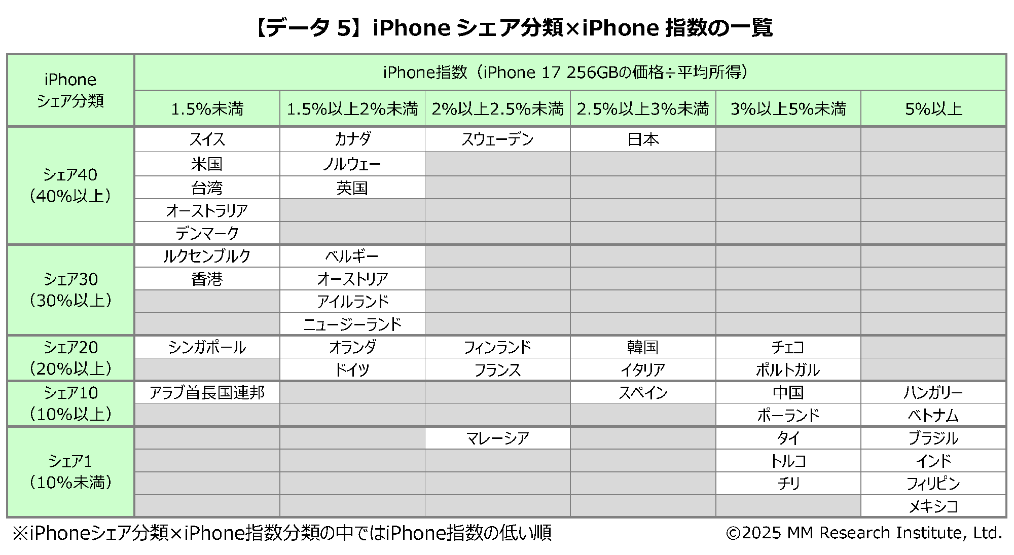 iPhoneのシェアが40%以上の10カ国の中では、日本のiPhone指数は最も高く、その理由としてMM総研では米ドルが円安傾向であるなどと指摘。