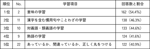 「先生の説明」が最も役立つと感じた学習項目は、「意味の学習」(54.4%)が最多で、「漢字を含む慣用句やことわざの学習」(46.3%)も高く評価されている。漢字を形だけでなく、文脈と結びつけて理解する場合や背景や由来について教員の説明が加わることで、理解をより深める助けになったと推測されるという。
