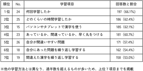 同調査は、東京学芸大学 教授の高橋 純氏と同大学 准教授の登本洋子氏が提示した「漢字学習において必要な学習項目」に基づき、どの学習方法が最も役に立ったかを児童に調査。9月28日に開催された「日本教育工学会(JSET)2025年秋季全国大会」で、研究成果(講演論文集の347~348ページ)として発表されている。