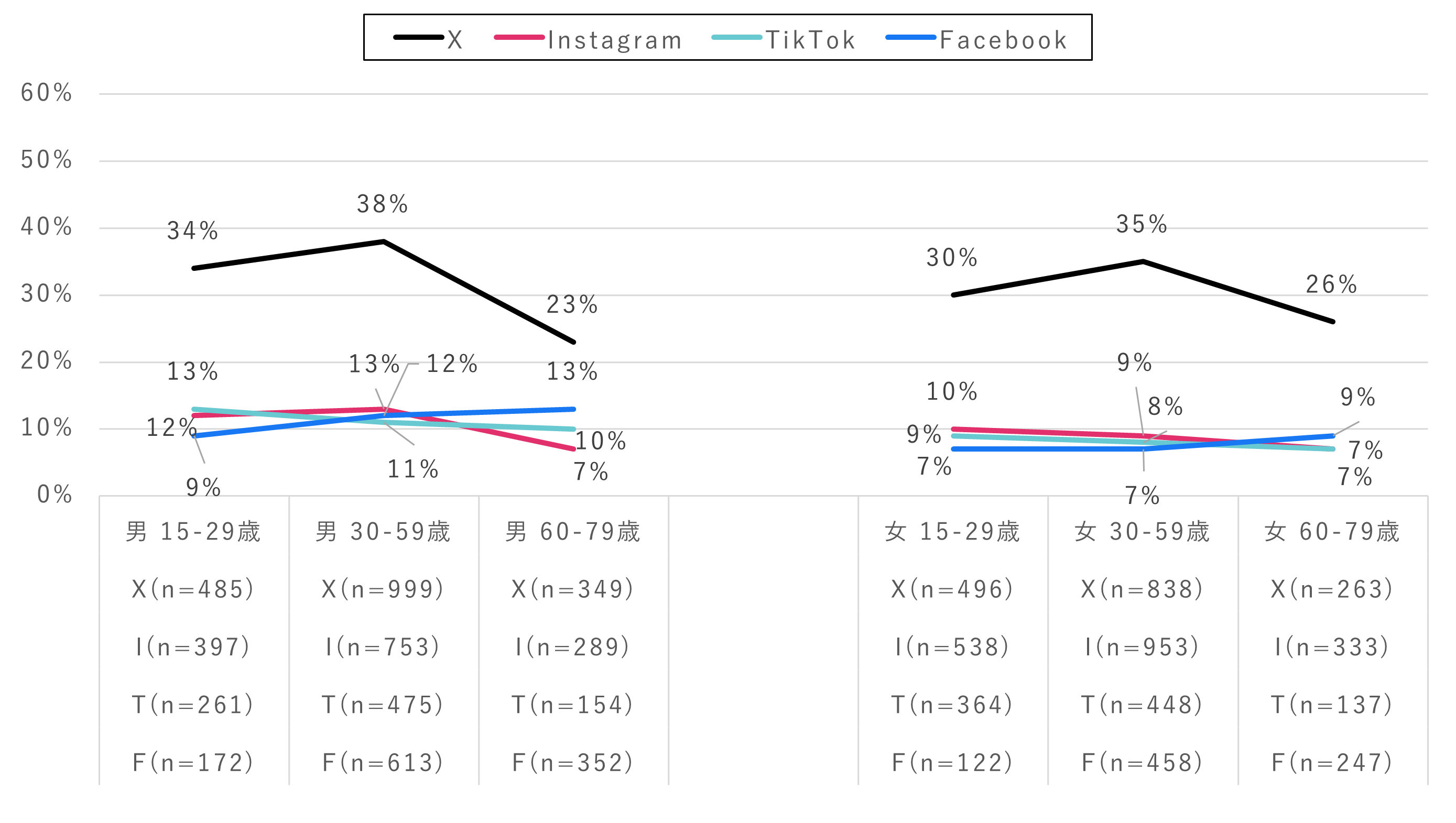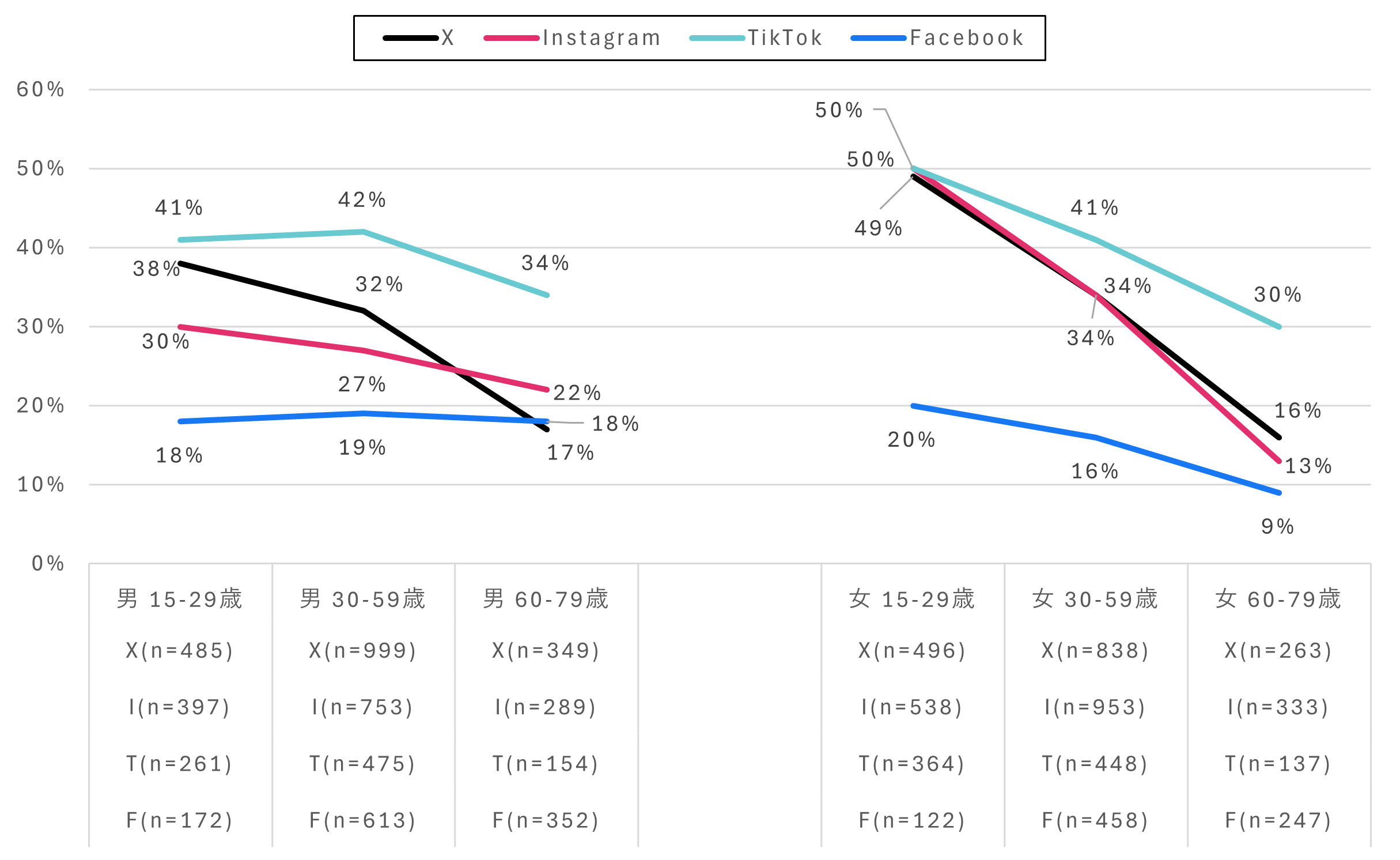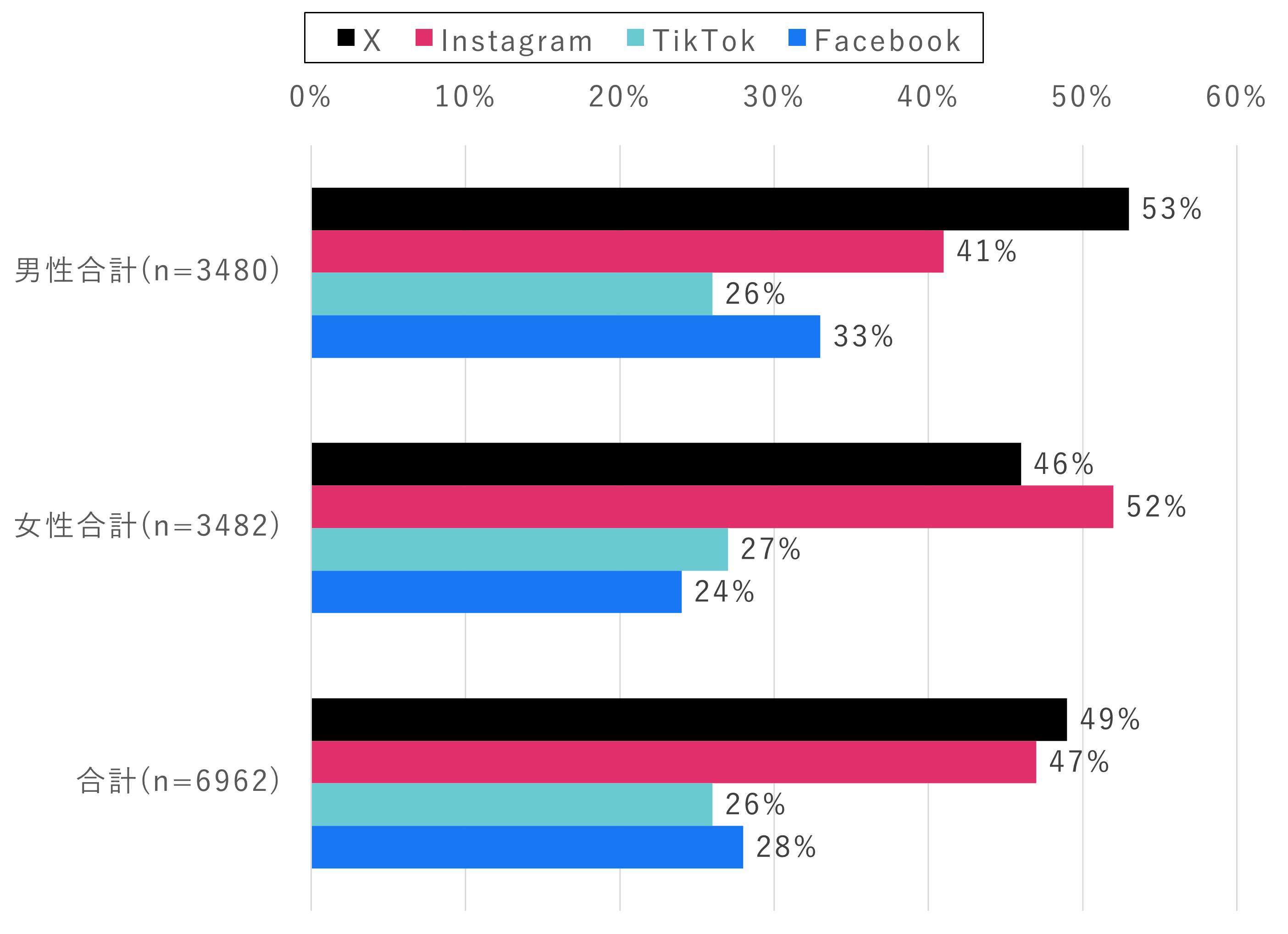 調査によると、XとInstagramの利用率は全体で約5割、TikTokとFacebookは約3割であった。男女別では、男性はX、女性はInstagramの利用率が高い。