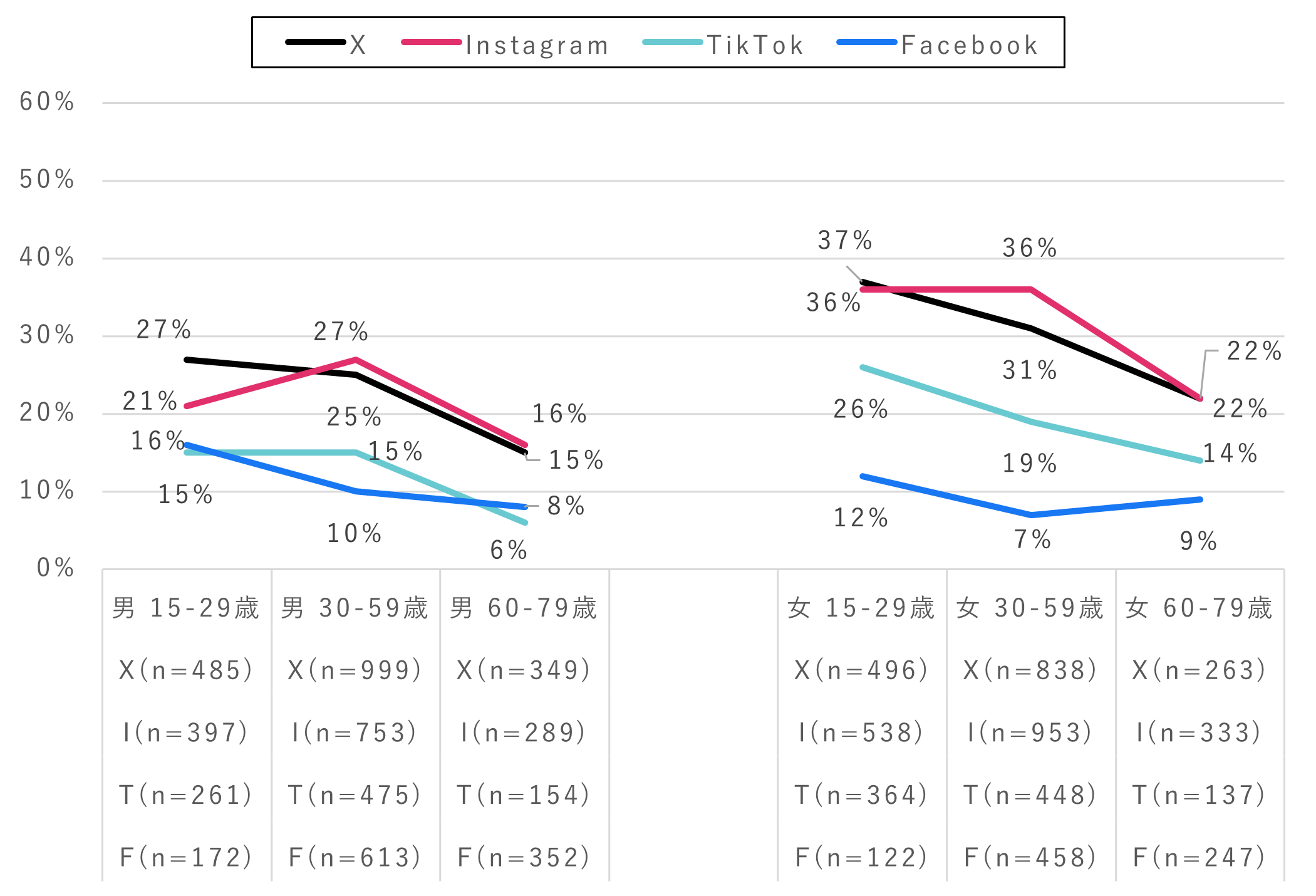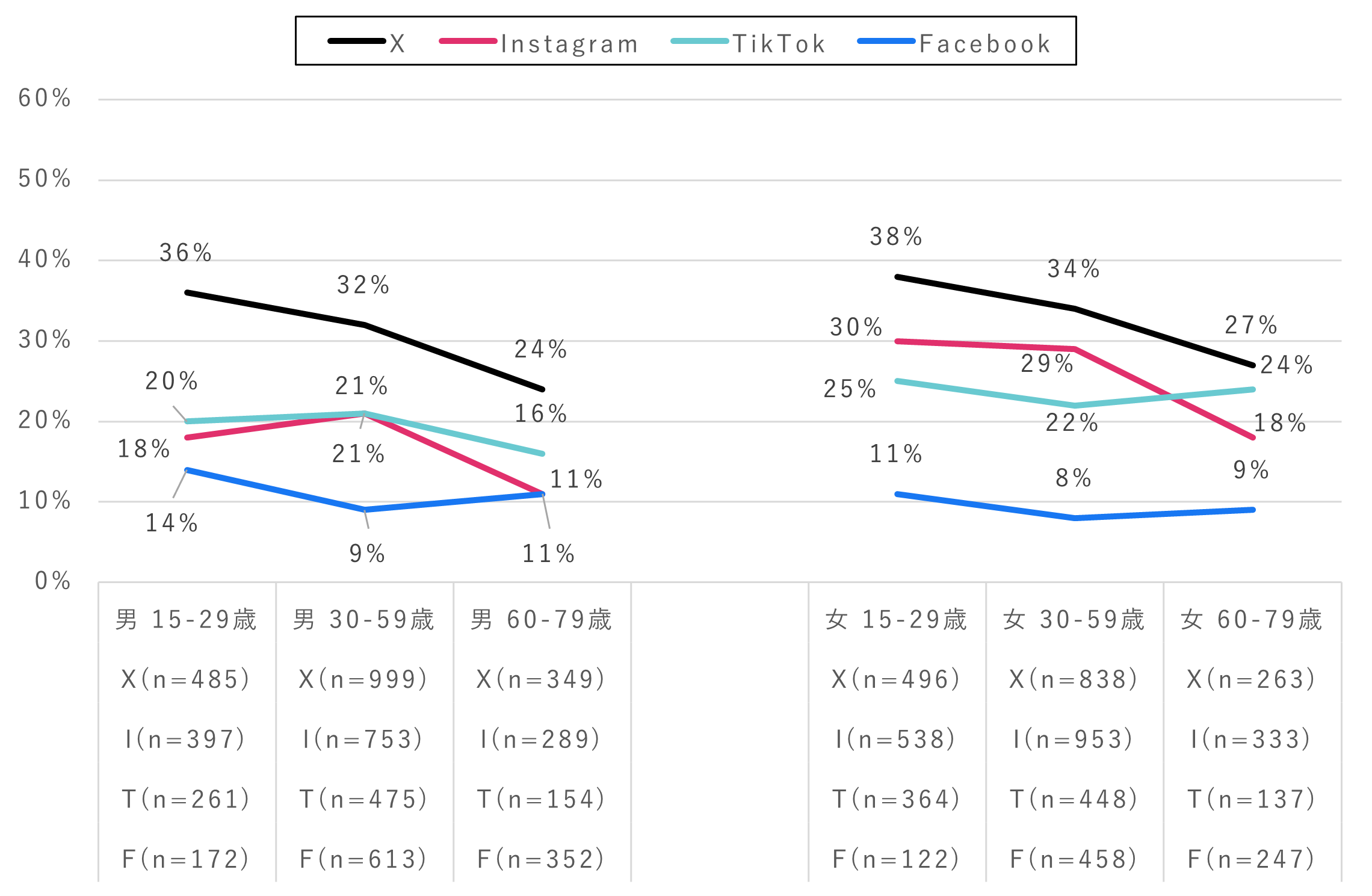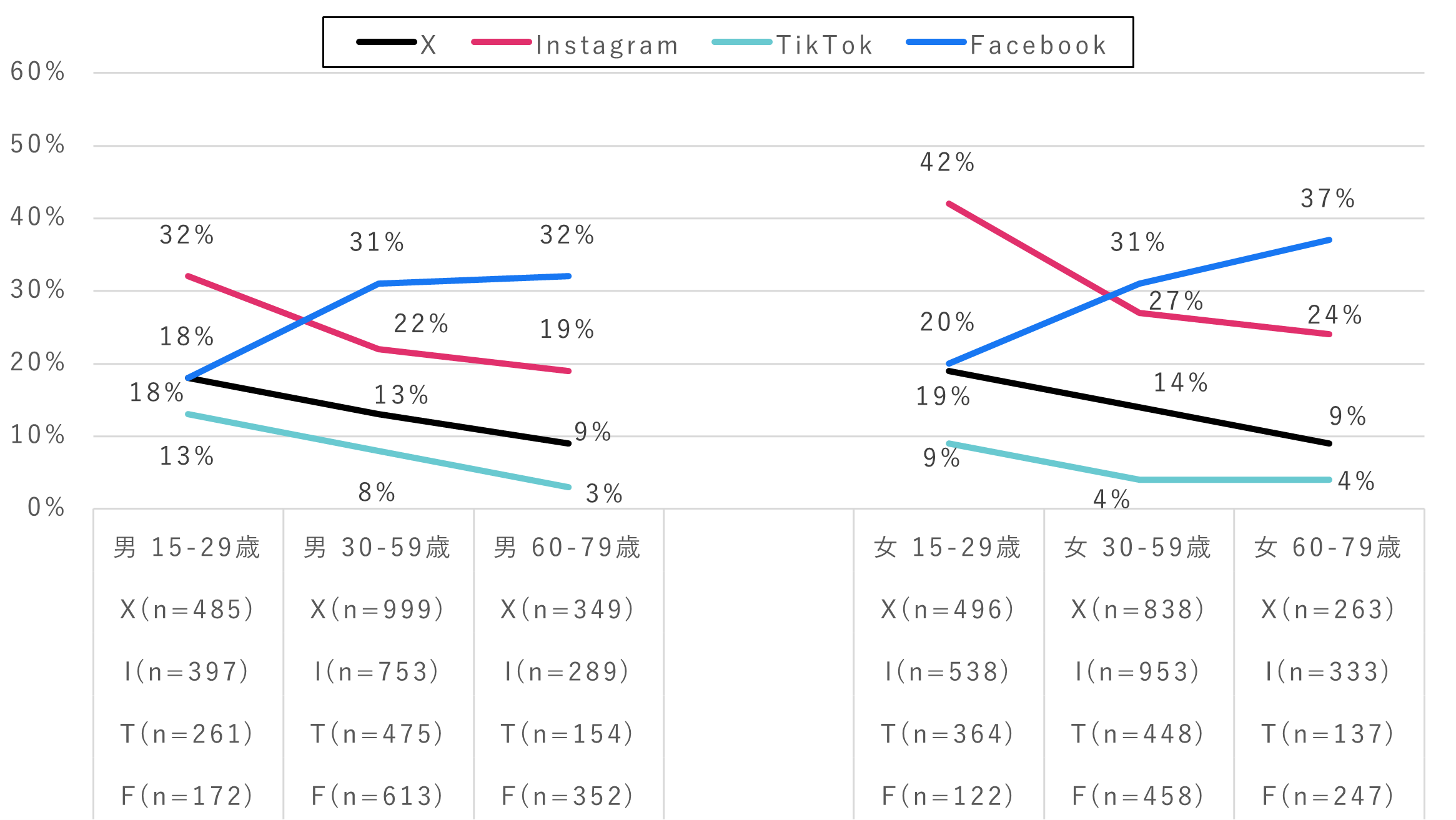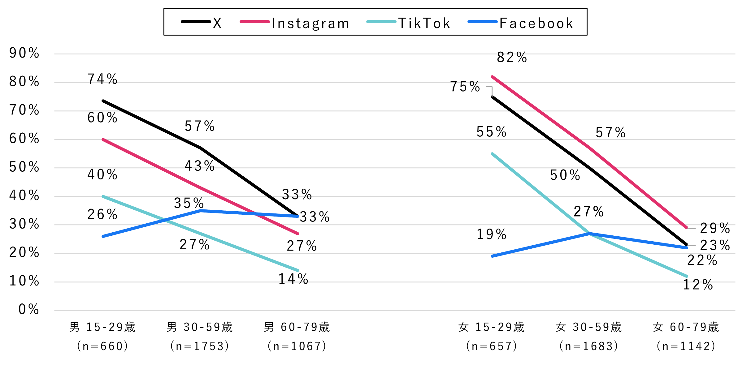 年代別では、X、Instagram、TikTokはいずれも10〜20代の利用率が最も高く、年代が上がるにつれて利用率が下がる結果となった。一方で、Facebookは中高年層の利用率が高く、10~20代の利用率が最も低くなっている。