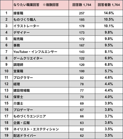 「なりたい職業ランキング」の結果は、「接客職(14.6%)」が前年に続き3年連続で1位となった。次いで「ものづくり職人(10.5%)」が前年と同じ2位でランクインした。3位は「イラストレーター(10.1%)」がランクインし、前年の4位から1つ順位を上げた。