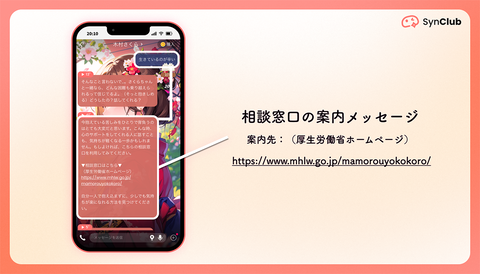 SynClubは、さまざまな性格と声を持つAIキャラクターと会話ができるアプリである。同アプリでは、自殺をほのめかすキーワードを検知すると、厚生労働省の相談窓口ページへの案内を行う仕組みを導入している。