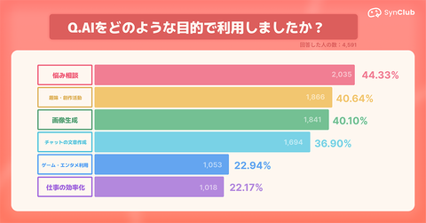AIの利用目的を聞いたところ、全体の44.33%が「悩み相談」と回答し、趣味・創作活動(40.64%)、画像生成(40.10%)と続く。