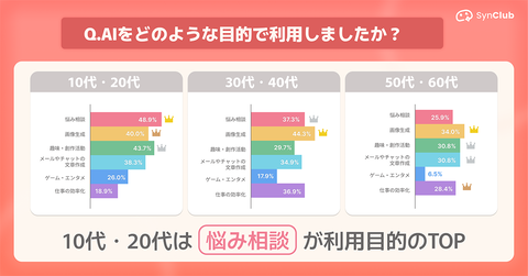 世代別に分析すると、10代と20代は「悩み相談」(48.9%)の答えが最多で、30代・40代と50代・60代では「画像生成」が利用目的の1位となった。