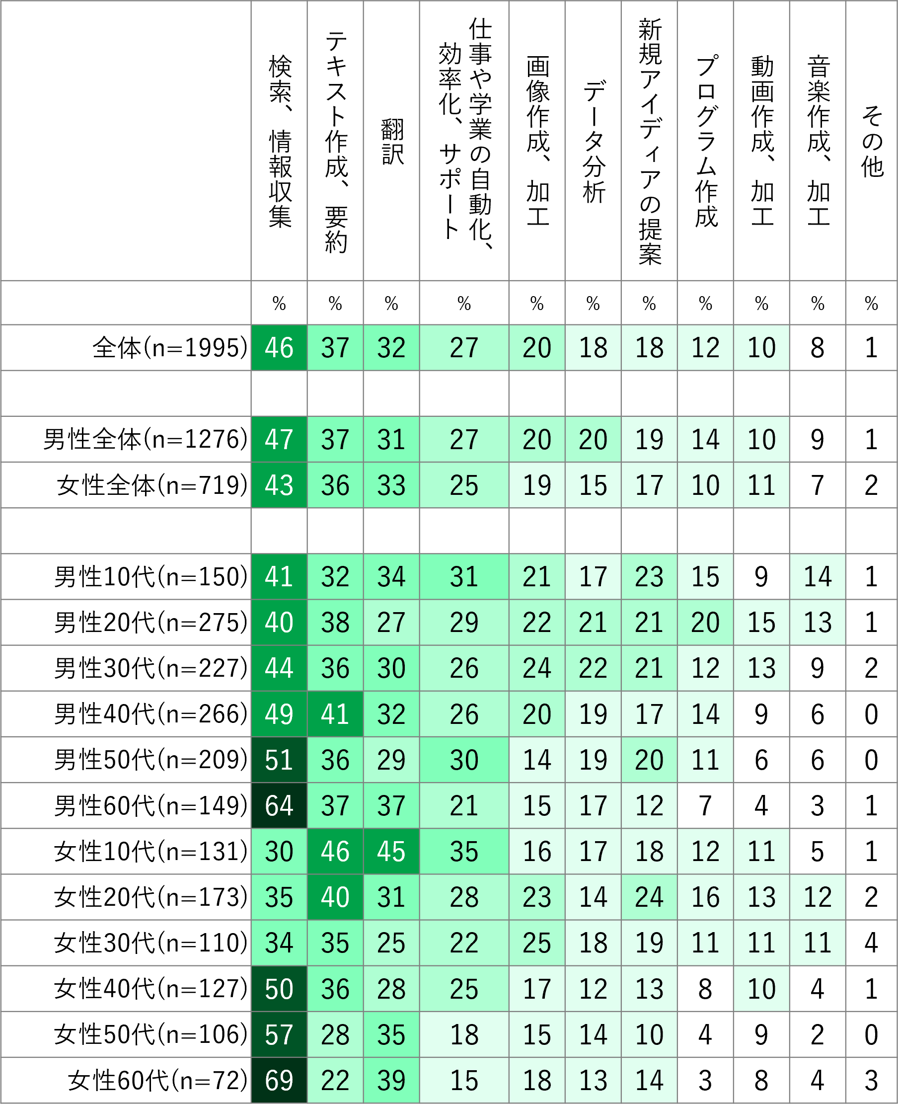 調査によると、生成AIの利用用途として最も多かったのは「検索、情報収集」で46%、次いで「テキスト生成、要約」が37%、「翻訳」が32%となっている。性年代別では、男性20代が「データ分析」や「プログラム作成」など幅広く活用をしていると回答した。