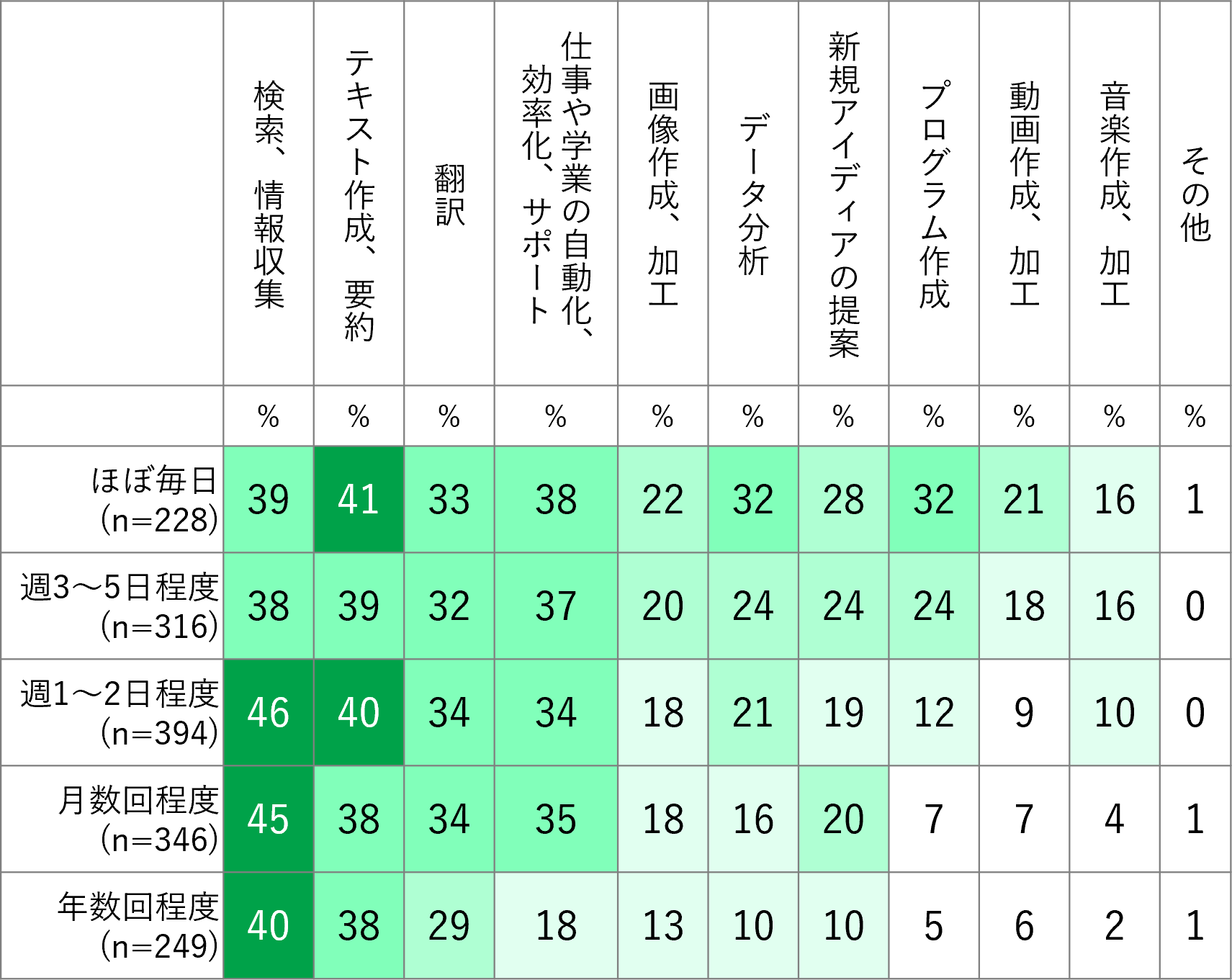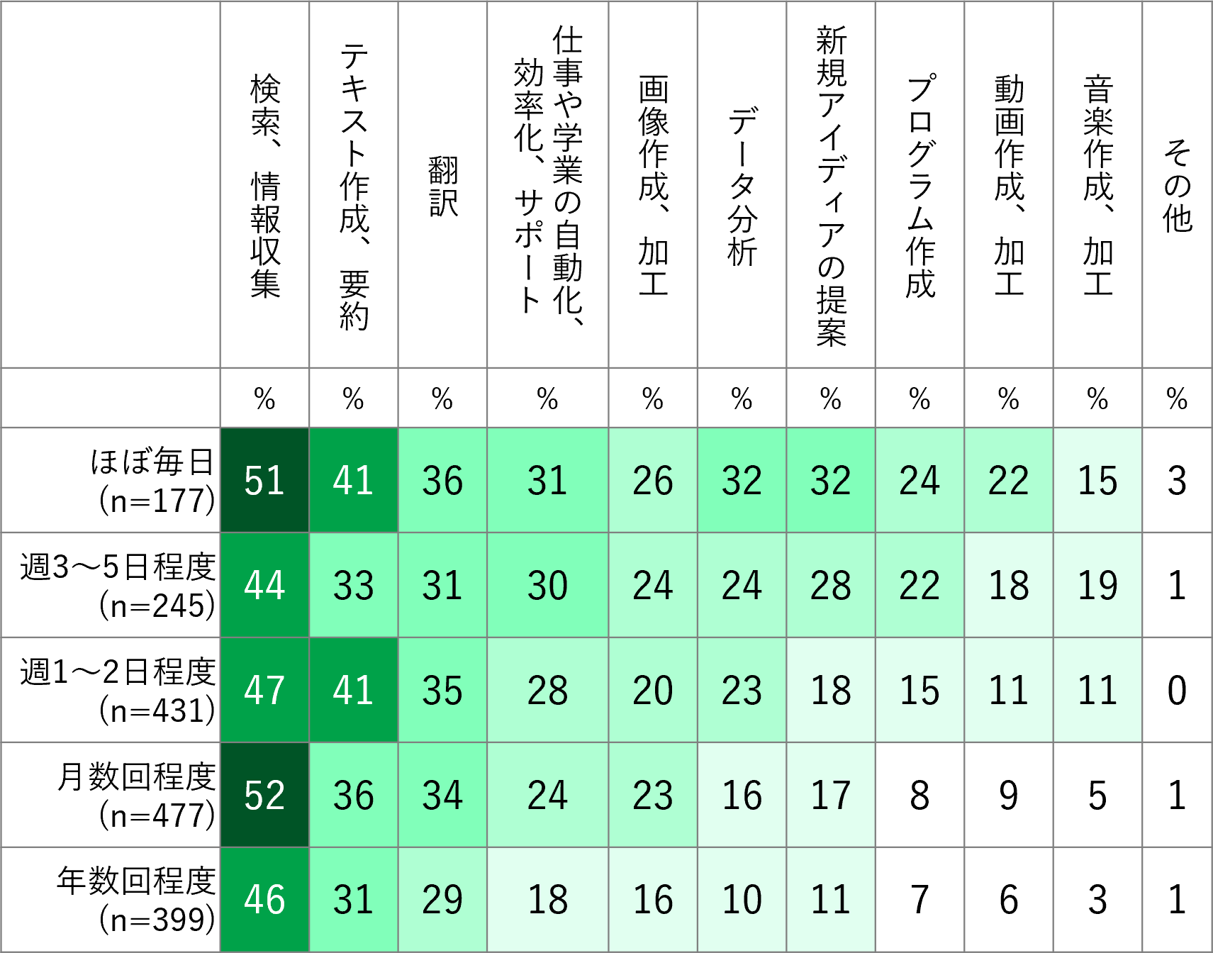 また、利用頻度と用途の関係についても分析されている。仕事や学業で生成AIを頻繁に使う人は幅広い用途に活用する傾向が強く、プライベートでほぼ毎日利用している人の約5割は「検索、情報収集」、約4割は「テキスト生成、要約」に活用していた。