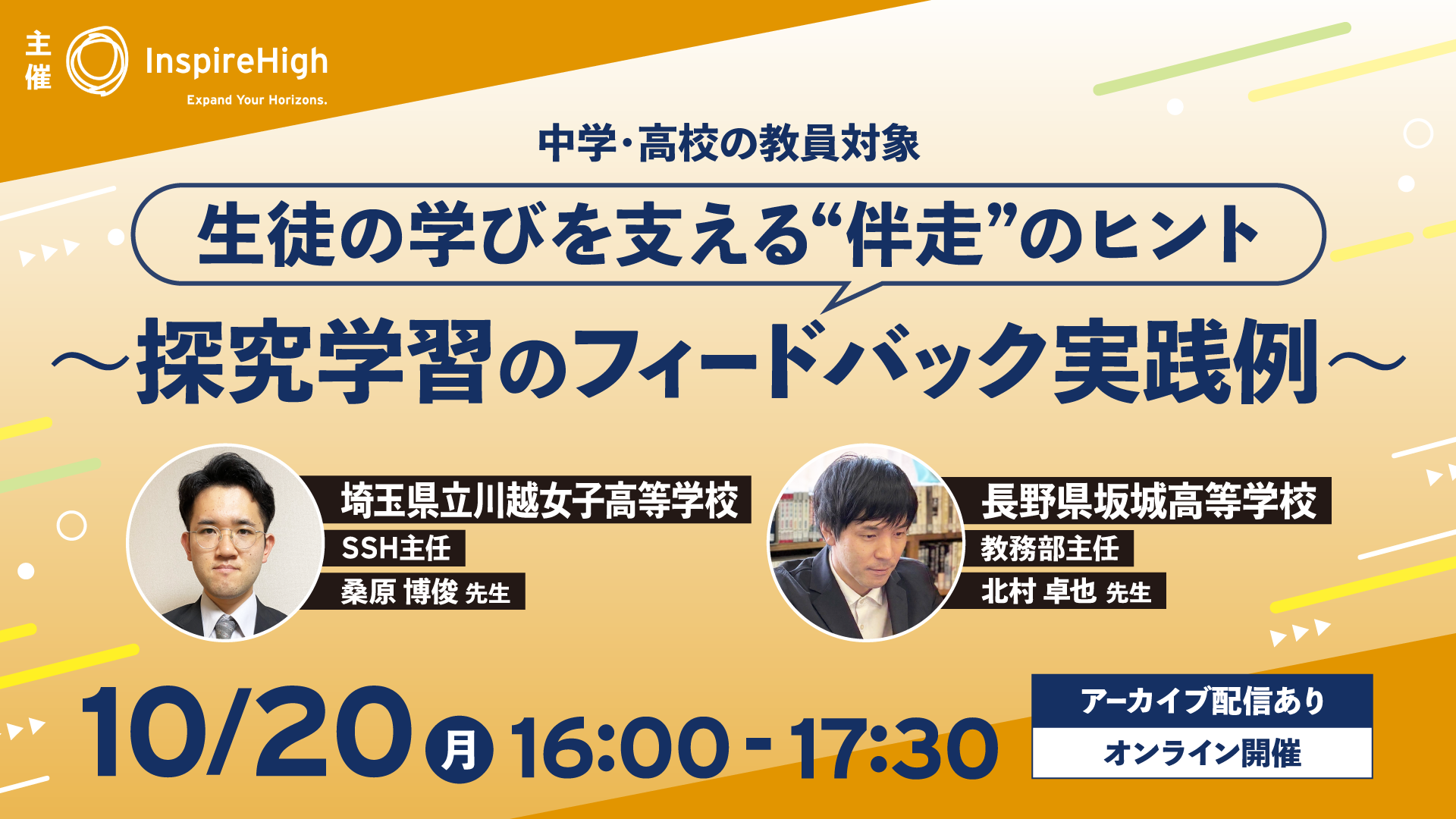株式会社Inspire Highは、中学校・高等学校の教員向け探究学習オンラインセミナーを10月20日(月)に開催すると発表した。