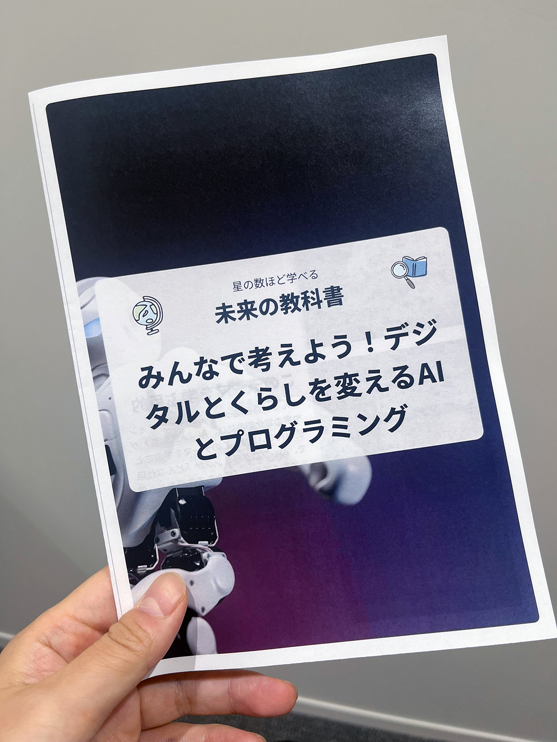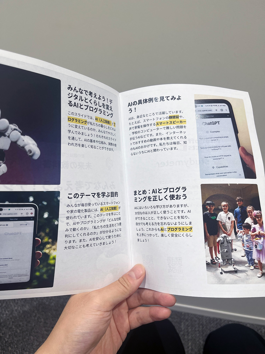 動画生成と同時に、A4サイズ両面1ページで印刷できるPDFが自動出力される。二つ折りにすると小冊子のように読める仕様で、展示会場では毎日新たに生成された教科書を展示し、来場者同士が「今学びたいテーマ」を共有できる仕組みになっている。