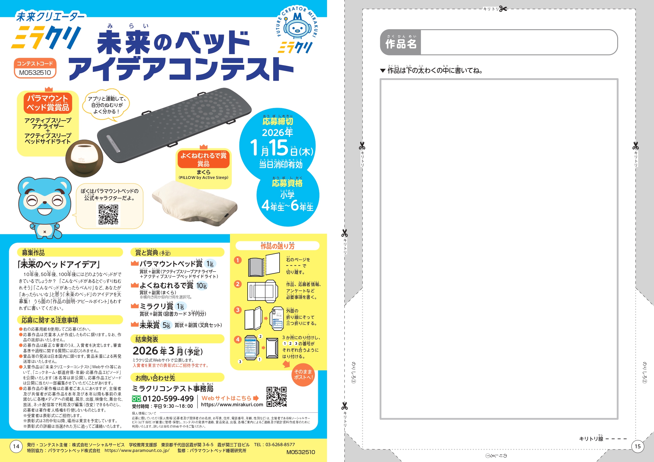 関連企画として、同社は「未来のベッドアイデアコンテスト」を開催する。教材のページを切り離して郵送での応募が可能で、締切は2026年1月15日(木)の当日消印有効。入賞者には、睡眠計測センサー「Active Sleep ANALYZER」と光や音を自動で制御できるライト「Active Sleep BEDSIDE LIGHT」のセットや、寝返りしやすい枕「PILLOW」などの賞品が贈られる予定となっている。