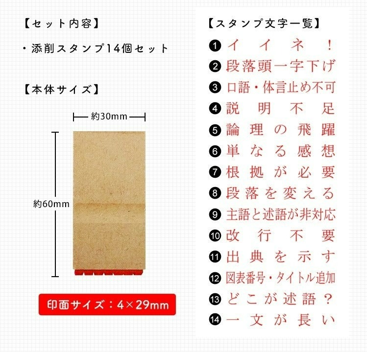 文章ゼミは、教員の声をもとに開発した添削用スタンプで、「説明不足」「論理の飛躍」「単なる感想」「一文が長い」など、添削でよく使われる14種類のコメントがセットになっている。