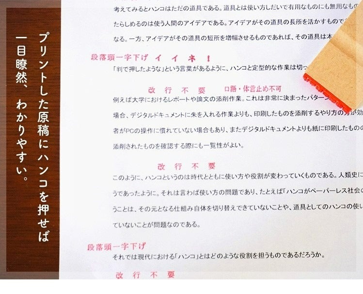 同製品には、ゴム印タイプと浸透印タイプがあり、ヨコ書きとタテ書きをそれぞれラインアップしている。ヨコ書きのゴム印タイプは印面サイズが約4mm×29mmで、ヨコ書きの浸透印タイプは印面サイズが約8mm×30mm。プリントした原稿にそのまま押すことで、指摘内容が一目で伝わるよう工夫した。