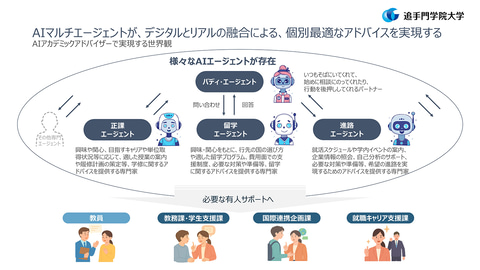 同機能は、マルチエージェント構成の学生向け生成AIアドバイザー。大学の統合データベースに蓄積された学修情報や学内情報、学生の学びやキャリアに関する興味・関心をもとに、履修・資格取得・留学・就職活動、課外活動など、学生生活に関する相談に対して、個別最適なアドバイスを提供する。