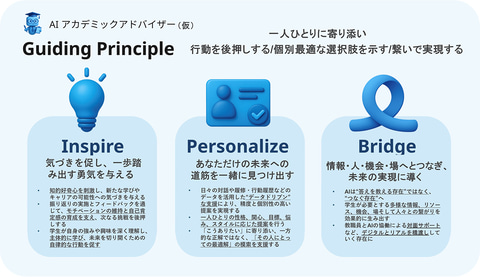 マルチエージェント構成の特徴は、正確性(精度の高い応答)・保守性(応答改善のしやすさ)・拡張性(新しい分野への拡張)の3つ。「Inspire(気付きを促す)」「Personalize(個別最適化)」「Bridge(人や情報をつなぐ)」を柱に据え、AIが全てを解決するのではなく、学生の挑戦や成長を促すパートナーとして位置付け、必要に応じて対人支援につなげるという。