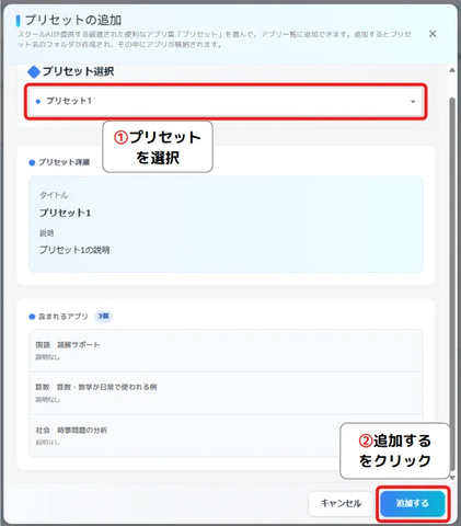 プリセット機能では、「教務・校務」「各教科」「総合・探究」の3つの分野ごとに、教育現場で特に利用頻度の高いアプリをパッケージ化。アプリ管理画面から「プリセットを見る」ボタンをクリックし、目的に合ったプリセットを選択するだけで関連する複数のアプリを瞬時に設定可能だ。