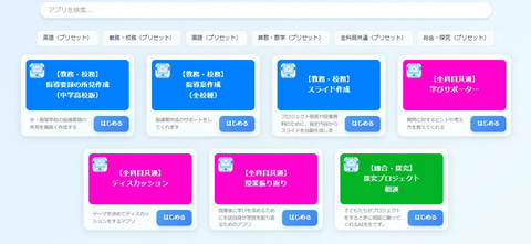 同機能は、全国の小中高校、大学の教員の意見を元に開発。授業準備にかかる時間の短縮や校務の効率化を支援し、教員が教育活動に集中できるよう設計している。プリセットには、指導案作成や指導要録所見作成、スライド作成、学びサポーター、問題作成、ディスカッション支援、授業の振り返り、探究プロジェクト相談といった推奨アプリのセットが含まれる。
