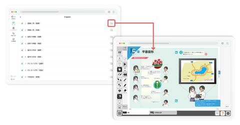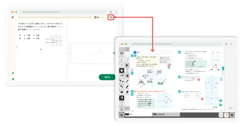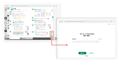 また、Qubenaの問題画面や問題一覧画面に表示される教科書のアイコンをタップすると、対応するデジタル教科書の該当ページにジャンプ。生徒は教科書ですぐに学習や振り返りができる。