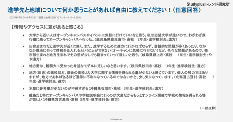 一方で、自由回答では「地域によって情報やアクセスに差があると感じる」などの声が寄せられた。北海道・東北・九州の高校生からは「レベルの高い大学を地方に作ってほしい」「地方勢は難関大に受かった身近なモデルが乏しい」など、都市圏との差を訴える声も挙がっている。