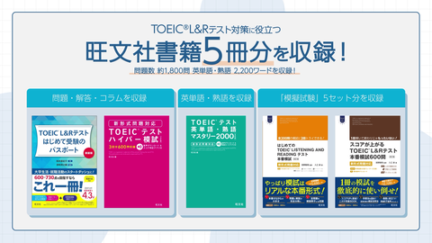 同ソフトには、株式会社旺文社が出版したTOEIC L&Rテスト対策に役立つ書籍5冊分の内容を収録。約1,800問の問題と2,200語の英単語・熟語が収められている。ユーザーは「試験ガイド」「英単語・熟語」「模擬試験」などのモードを通じて、実力に応じた効率的な学習が可能だ。