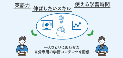 最新の生成AI技術の活用と、生徒と教員双方のデータ連携により、個人の英語学習のみならず、学校での英語授業内でも活用できる。学力が多様な教室内においても、AIを活用した個別対応を行うことで、教員の授業の負荷を減らしながら、生徒それぞれに対して英語4技能の個別最適な学習内容を提供可能。また、英語検定「GTEC」の蓄積データと組み合わせて、志望大学に応じた学習プログラムを設定することもできる。