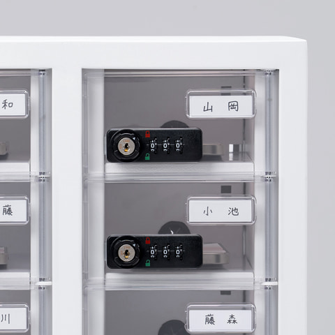 透明な扉の鍵は個別に暗証番号を設定できるダイヤル錠となっており、収納した人が鍵を持つ必要がない。また、暗証番号を忘れた場合には、管理者用のキーで番号を確認できる。扉には名前などを記載できるネームプレートもある。
