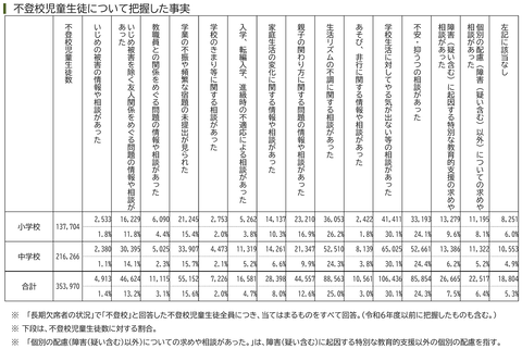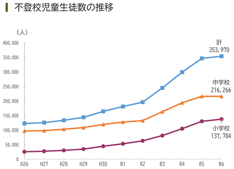 同調査によると、小・中学校における不登校児童生徒数は、合計で353,970人(前年度346,482人)で過去最多となり、12年連続で増加している。増加率は小学校が5.6%(前年度24.0%)、中学校は0.1%(前年度11.4%)、小・中学校全体が2.2%(前年度15.9%)で、前年度から低下した。