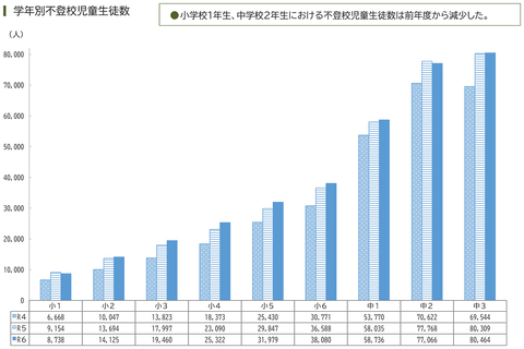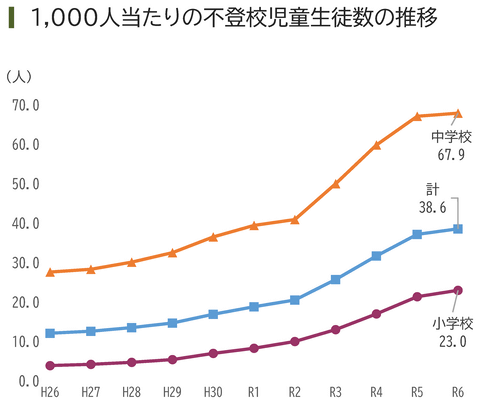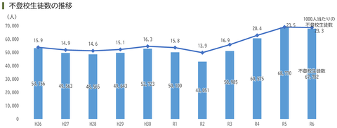なお、高等学校における不登校生徒数は67,782人(前年度68,770人)で、児童生徒1,000人当たりの不登校生徒数は23.3人(前年度23.5人)となり、いずれも前年度から減少した。