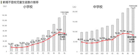 不登校児童生徒数のうち、新規不登校児童生徒数は小学校で70,419人(前年度74,447人)、中学校が83,409人(前年度90,853人)で、小・中学校ともに前年度から減少している。小・中学校合計の新規不登校児童生徒数は153,828人(前年度165,300人)で、9年ぶりに減少した。