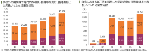 また、学校外の機関などで専門的な相談や指導を受け、指導要録上出席扱いとなった児童生徒数は42,978人に上った。さらに、自宅でICTを活用した学習活動を行い、出席扱いとされた児童生徒が13,261人、欠席期間中の学習成果を指導要録に反映した児童生徒数は81,467人と報告されている。