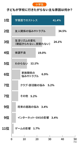 調査によると、小学生の子供が学校に行きたがらない理由の1位は「学業面でのストレス」で、41.4%の保護者が回答した。学習内容や授業の進め方、教員の教え方などへの不満が背景にある。また、34.5%が「友人関係の悩みやトラブル」、24.1%が「生活リズムの変化(朝起きられない、夜眠れない)」と回答した。