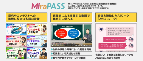 MiraPASSは、現役の起業家による映像教材とAIとの対話型ワークを組み合わせた探究学習・キャリア教育サービスである。生徒は起業家の体験をもとにした講義を視聴し、映像と連動したAIチャット「みらいワーク」を使って自分の興味関心を深掘りしていく。
