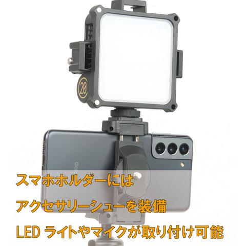また、上部にはスマートフォンホルダーを内蔵し、スマートフォンの向きを自由に動かせる自由雲台がある。取り付けできるスマートフォンの幅は67~92mm、厚さは10mmまで。ホルダーの上部にはアクセサリーシューを装備し、ライトやマイクの装着も可能だ。また、スマートフォンホルダーには一般的な三脚のネジもあり、ほかのカメラなどを装着することもできる。