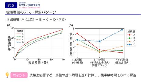 この結果から、成績上位の生徒ほどテスト序盤の解答速度が速く(図1の(a))、「速さ」と「正確さ」を両立させている生徒ほど、テスト全体の正答率も高い(図1の(b))という傾向が明らかとなっている。実施時の問題は、1問目から20問目が前学年の復習範囲だが、「復習範囲を速く正確に解く能力」がテスト全体の高い正答率に関する重要な土台となることが示唆された。