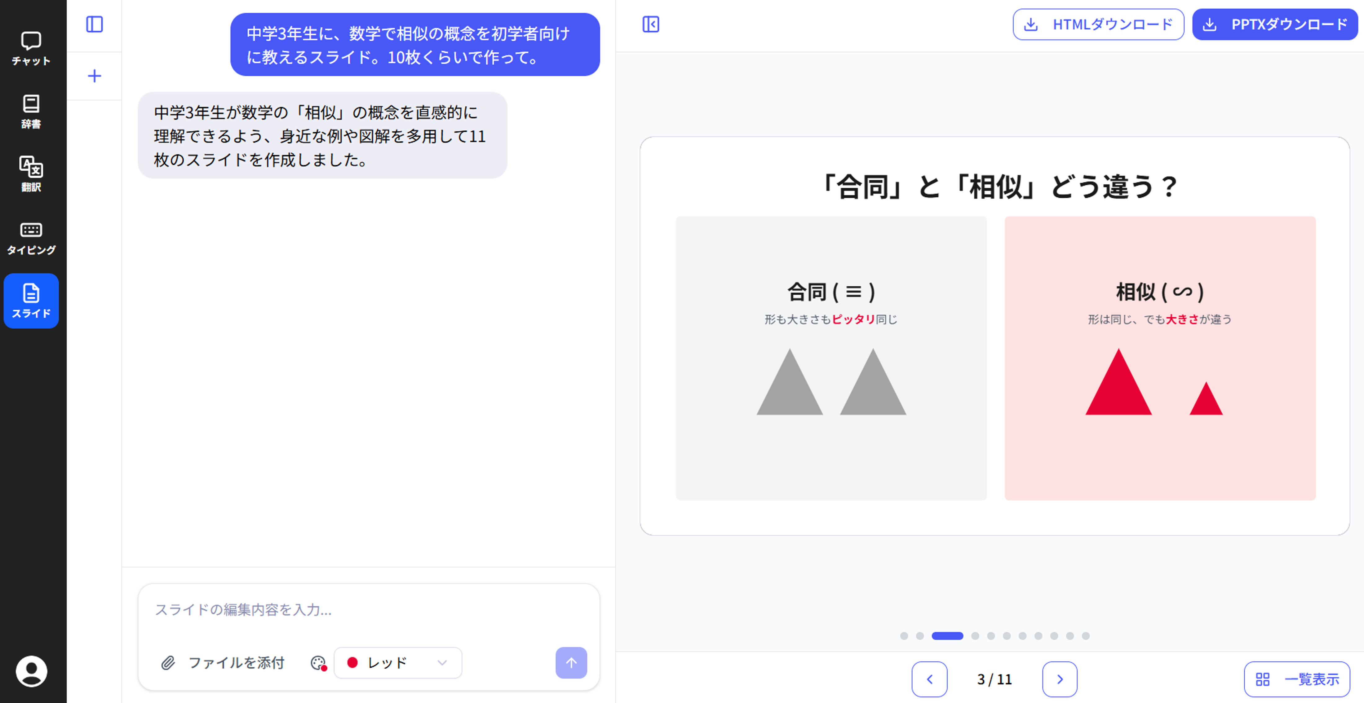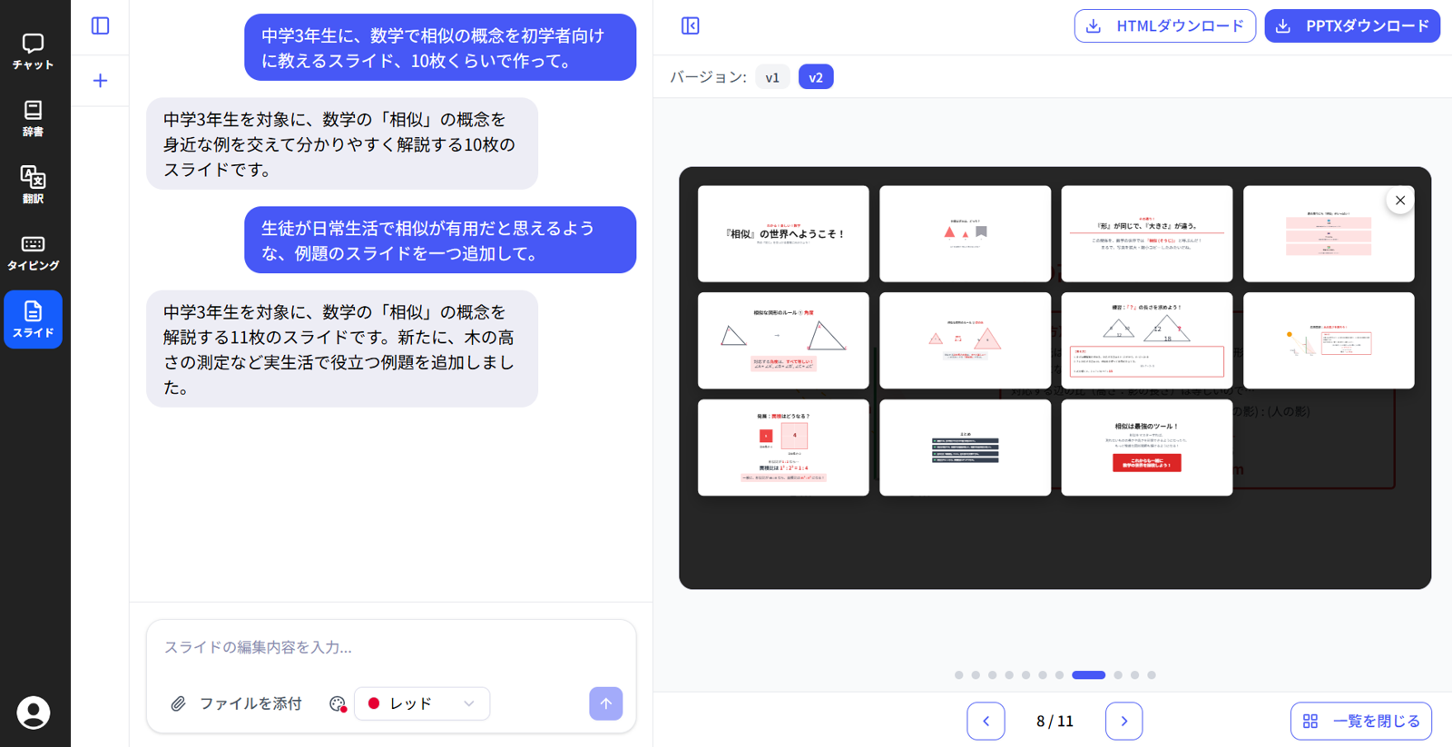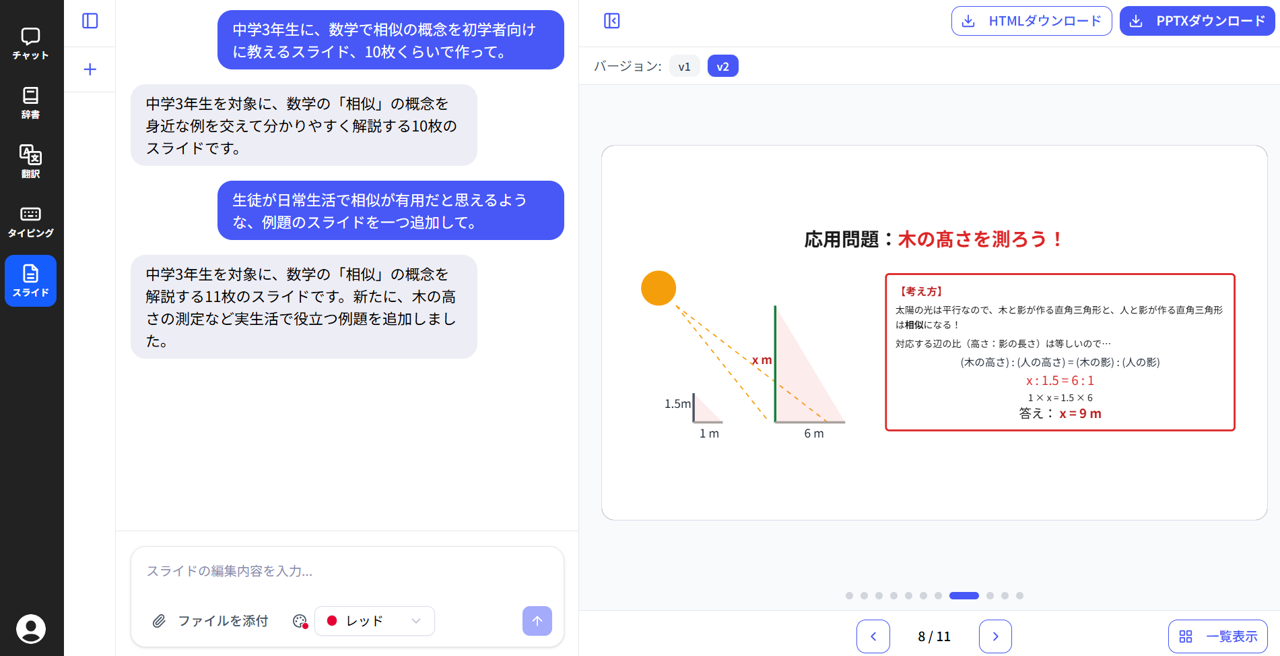 同機能を利用すると、入力された指示文(プロンプト)から6〜15枚のスライドを自動生成できる。単元目標など短い文章からでも生成でき、指導案の草案や授業用スライド、箇条書きのメモ、PDFファイルから資料を作成することも可能。