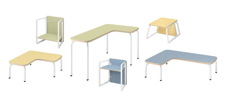 テーブルは、L字型の天板形状と2種類の高さが特徴で、ローテーブルは床に座ってリラックスした雰囲気で学びを進められるほか、ベンチとしても活用できる。
