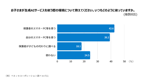 生成AIの利用環境としては、保護者のスマートフォンやパソコンを子供が使用するケースが42.6%と最多で、次いで自分のデバイスを使う場合が39.2%だった。保護者が子供の代わりに検索する割合は、18.1%にとどまっている。