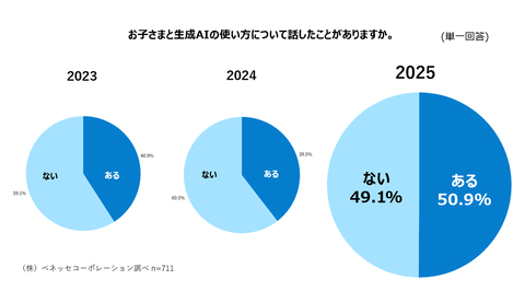 一方で、生成AIの使い方について対話を行った家庭は約5割にとどまり、2023年と比べて大きな進展は見られなかった。