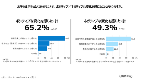 生成AI利用に関する変化を聞いたところ、保護者の65.2%は、生成AIを通じて「情報収集力が高まった」「考える力(思考力)が育っている」といったポジティブな変化を感じている一方、49.3%は「自分で考える機会が減った」といったネガティブな面も指摘している。