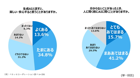 心理面に関しては、生成AIと話すと「楽しい」「安心する」と感じる小学生が48.4%で、「わからないことがあったときはまず生成AIに聞く」という回答は56.9%となっている。